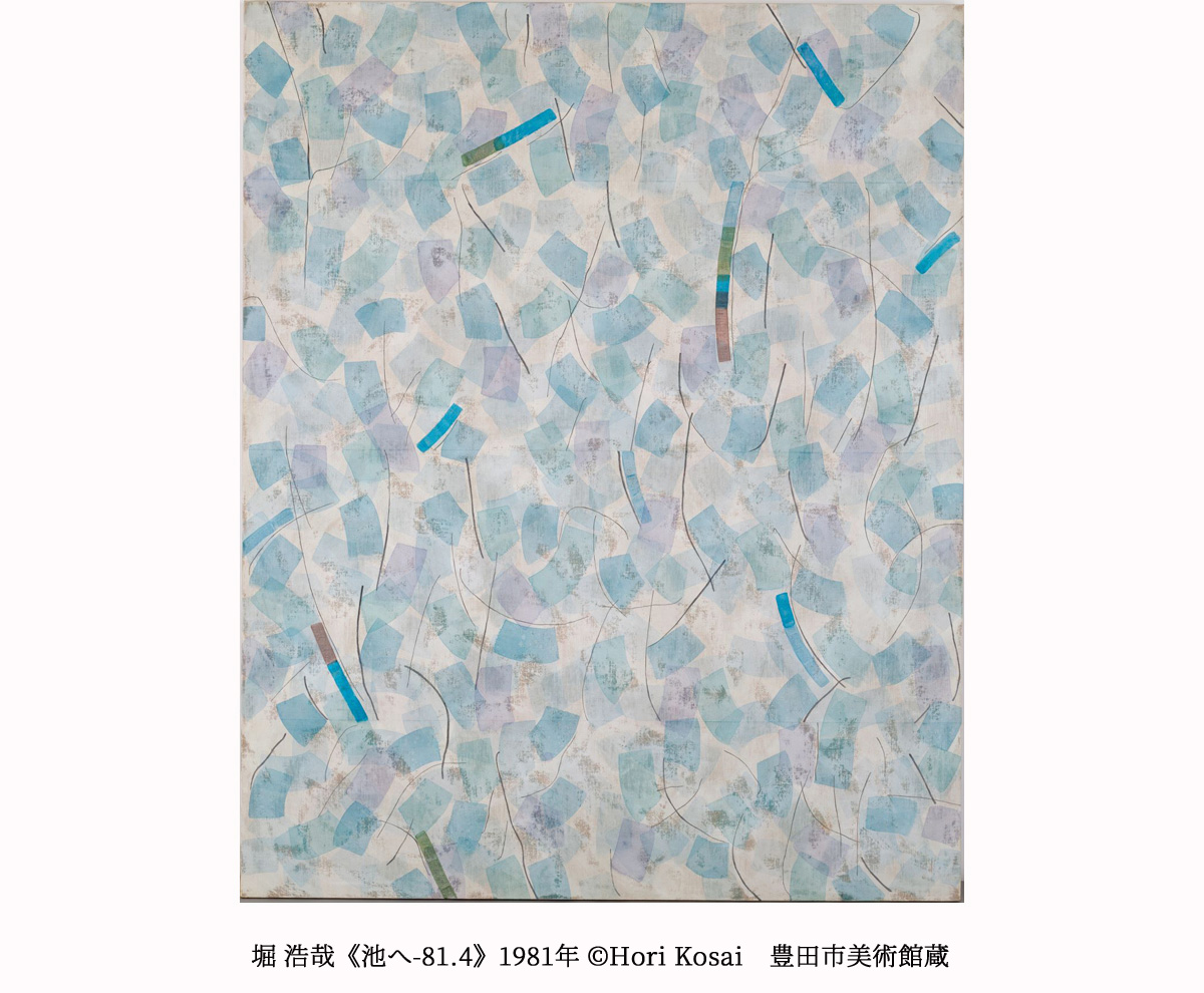 戦後50年代後半から70年代の日本の美術は、具体美術協会、ネオ・ダダ、もの派、美共闘などいくつかのグループが誕生しては解消し、また新たな動向が生まれるという、運動体の展開として描かれてきたといえます。しかし言うまでもなくその周辺では、斎藤義重や岡崎和郎、村岡三郎など、独自の時間軸に従って、息の長い制作を続ける作家たちがいます。豊田市美術館には、野村仁や河口龍夫など、同時代に関西を拠点にした作家たちの作品も多くあり、こうした作品もこの時代を見るうえで別の視点を与えてくれるでしょう。アプリケによる作品づくりを、日記を書くように日々の営みとして続けた宮脇綾子や、具体のメンバーという経歴を持ちながら、菓子箱を転用したり色紙を使ったりと、日常の延長線上で、ごく小さな作品を制作し続ける堀尾昭子にも、命名不要なアートの豊かさを認めることができるでしょう。