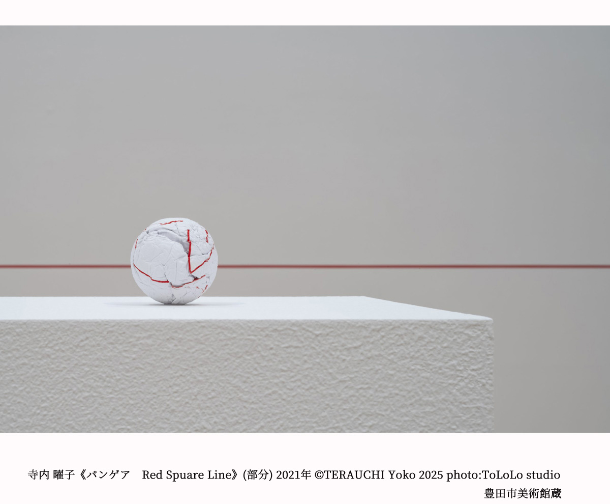 第Ⅱ期では、展示室1と3の二部屋を使い、日本の戦後美術の集団的な動向と、その傍らで、時に関心を同じくしながらも独り制作を続けた作家たちの二つの軸から紹介します。展示室2で展示するのは、2021年に寺内曜子が同室にあわせて制作した《パンゲア Red Square Line》です。展示室4では、迎英里子が産業都市豊田を念頭に構想した新作を披露し、つづく展示室5では宮脇綾子やウィーン工房の女性作家たちによる作品など、日常の延長線上に息づく作品を中心に紹介します。