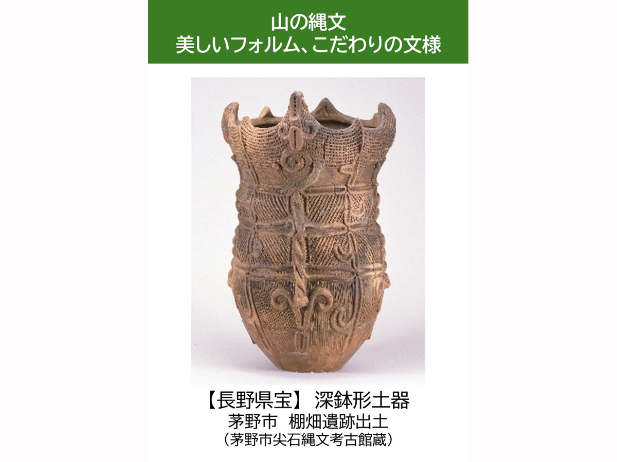 本展では、三河湾など沿岸部の遺跡と中部高地など山間部の遺跡の出土品を一堂に展示することで、縄文時代の両地域における暮らしぶりの違いや共通点、地域同士のつながりについて紹介します。