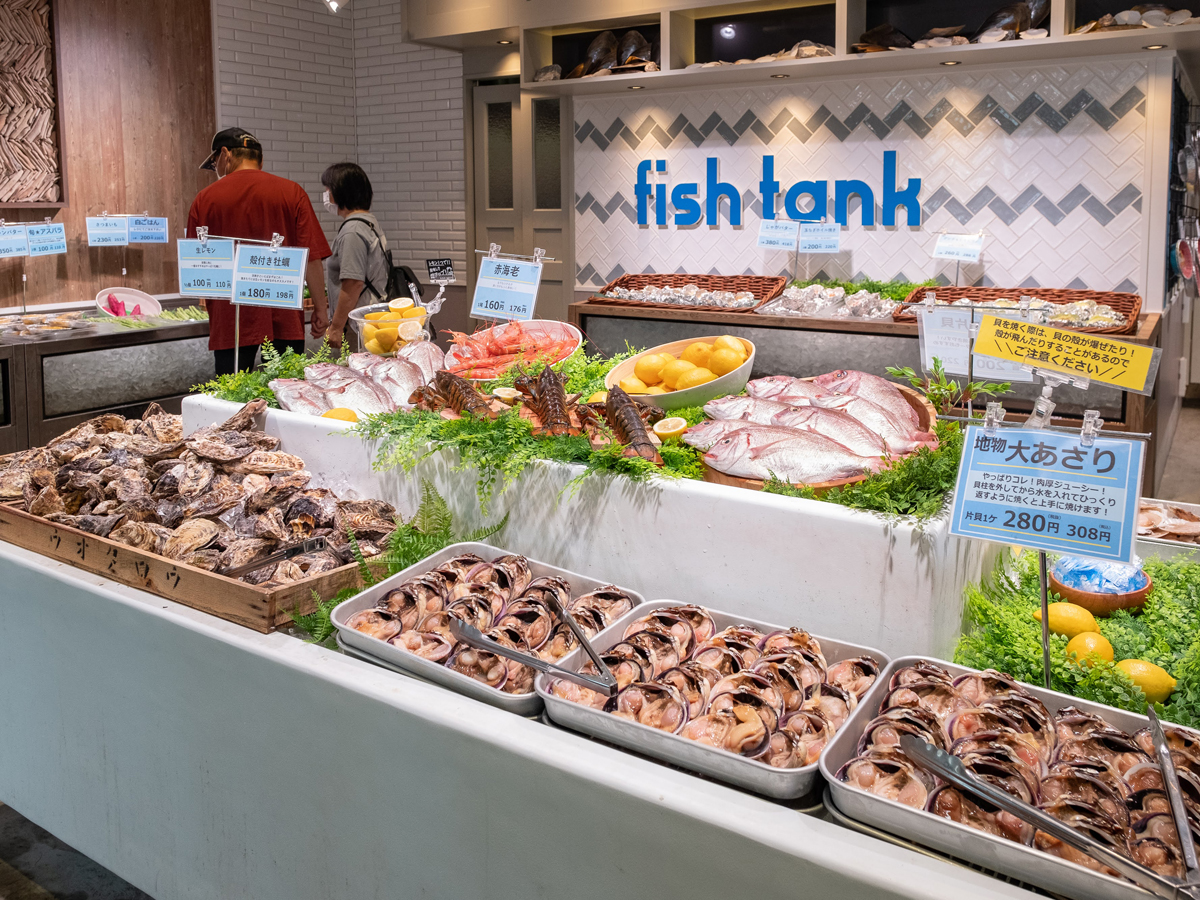 食材コーナーにはオープンキッチンを併設。獲れたて新鮮な鮮魚に串をうち味付けをしたり、活きたままの貝類を割りたてでご用意など、美味しく食べるための、ひと手間を目の前で致します。
