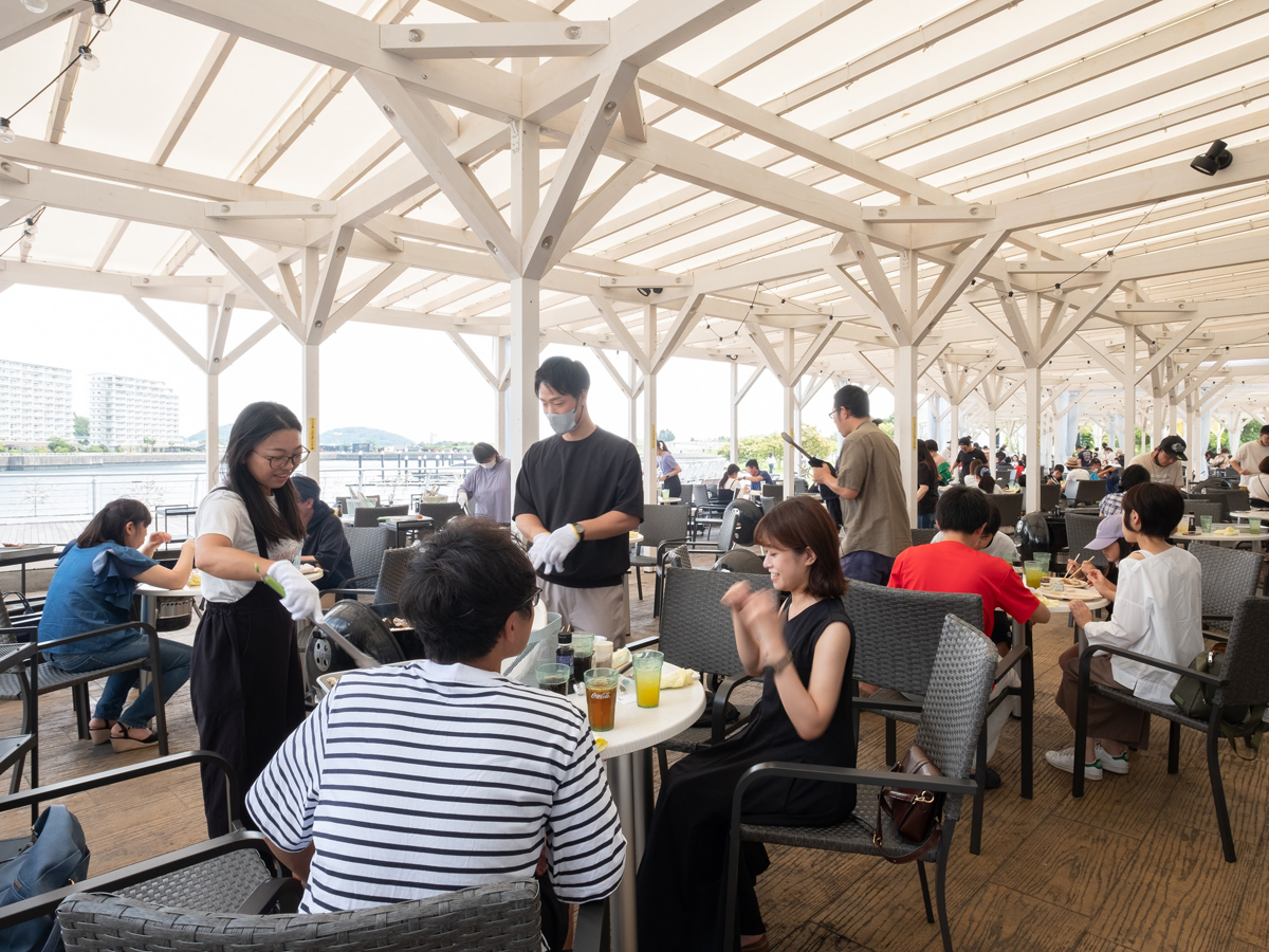 全350席は前日までWEBから予約が可能です。ラグーナ蒲郡のシンボルでもある大きな観覧車の下が店舗になります。港の前の屋外席は屋根付きの為、雨天の御利用も可能です。当日席もありますので予約なしの来店もOK!