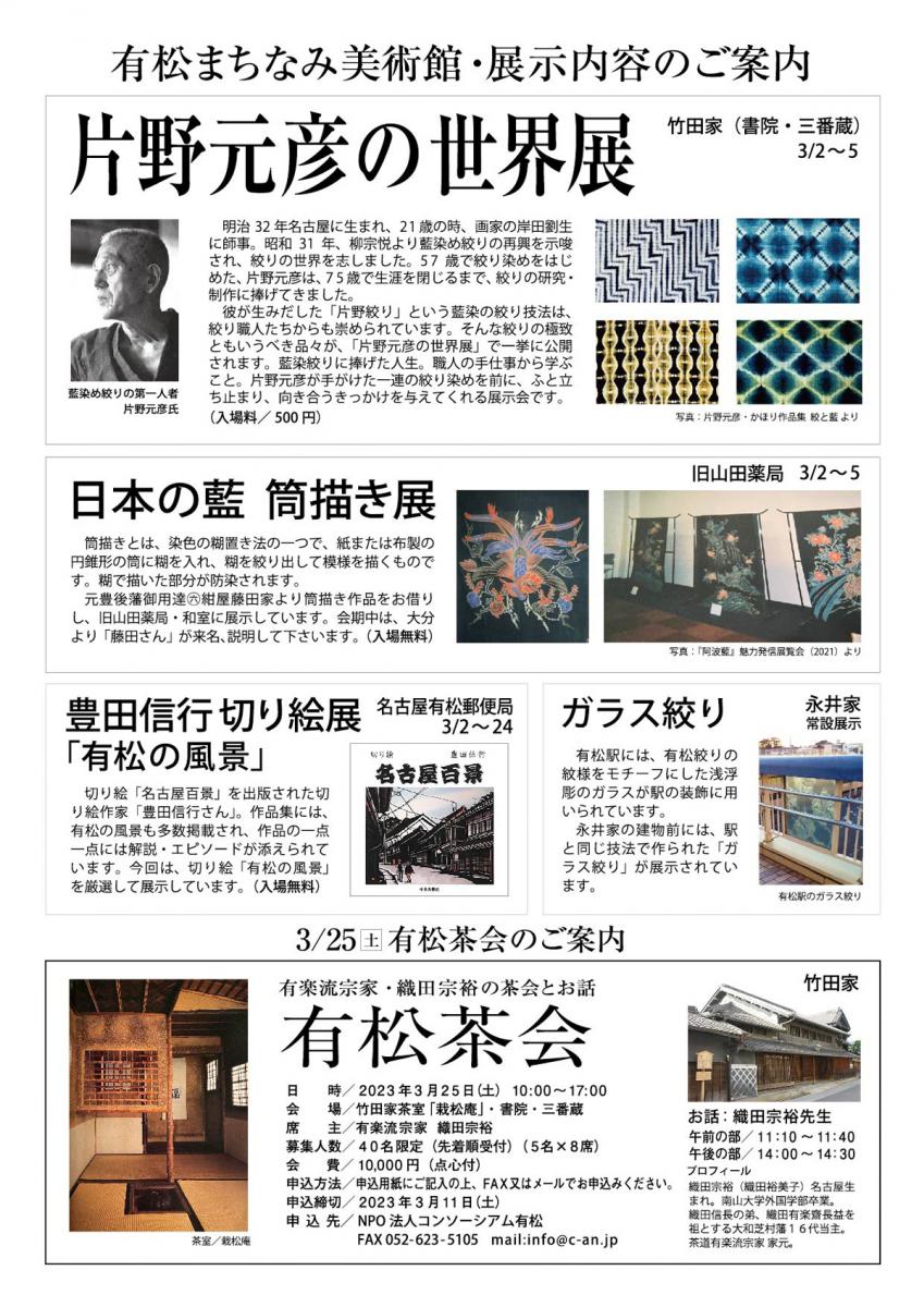 有松 東海道沿いの町家を会場に様々なアーティストの作品を展示する『有松まちなみ美術館』が開催されます。会場は、竹田家住宅(書院・三番蔵)、旧山田薬局、名古屋有松郵便局、永井家建物前の4会場。まちなみを散策しながら、お気軽にお立ち寄りください。