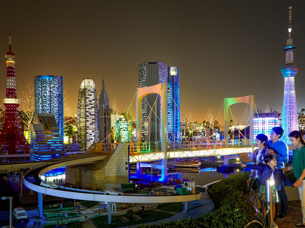 日本の都市や名所を1,000万個以上のレゴ® ブロックで再現した"ミニランド"は、ライトアップが美しく、夜でも大人気エリアのひとつ。