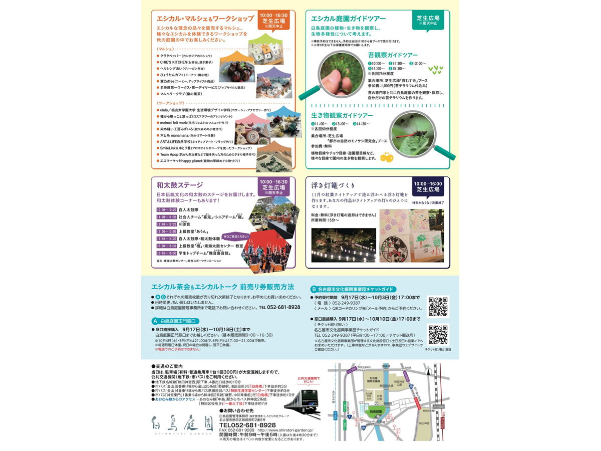 白鳥庭園では名古屋まつりの開催と同時に、秋の涼風を感じられる茶会や、環境・人・社会に優しい製品を取り扱うエシカルなお店が集合します。