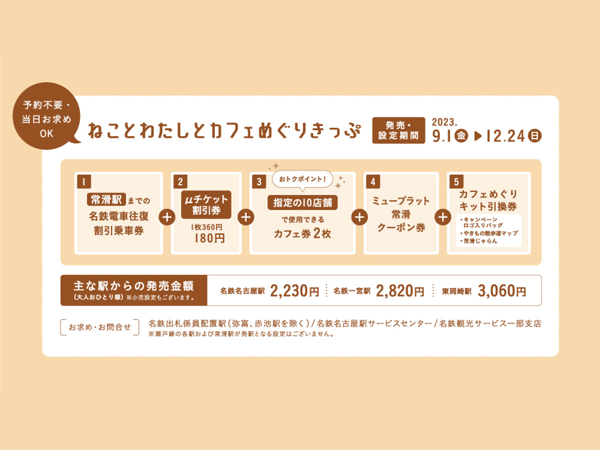 予約不要・当日購入OKのおトクな「ねことわたしとカフェめぐりきっぷ」をお買い求めいただき、やきもの散歩道内のカフェ(対象10店舗)を楽しんだり、常滑市内のカフェで撮影した"推し(オススメ)"写真をInstagramに投稿して選ばれた方にカフェおかわり券がもらえる「#ねことわたしとカフェめぐり」フォトコンテストに応募してみたり、常滑市で素敵なひとときを過ごしていただけるキャンペーンです♪