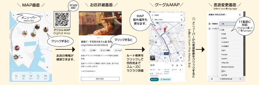 デジタルマップでお店の位置、お店情報、クーポン特典、ルート検索ができます!