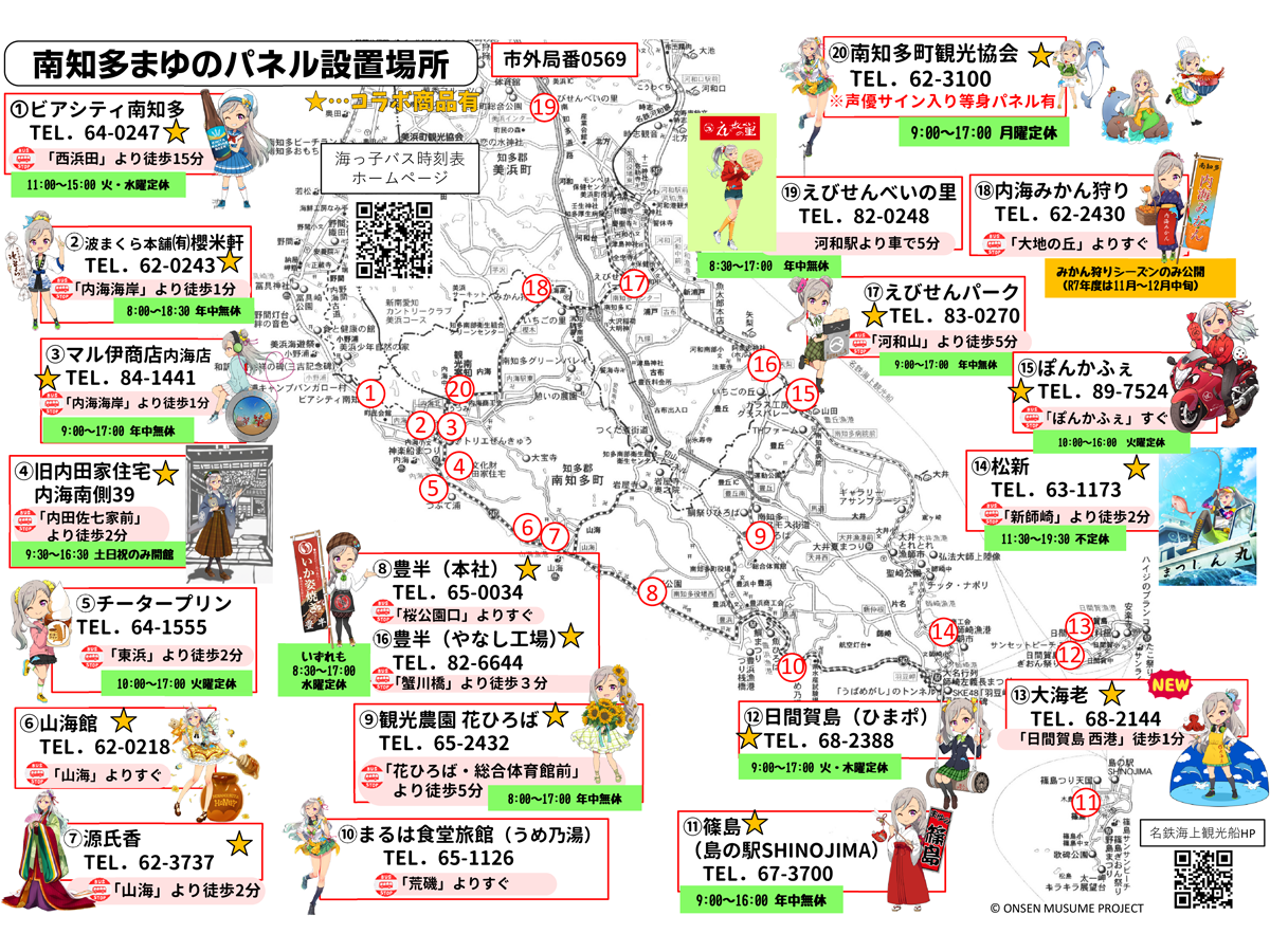 各施設のパネル設置・グッズ販売状況は南知多町観光協会 公式サイト「温泉むすめ「南知多まゆの」情報」詳細ページ)>>をご覧ください。