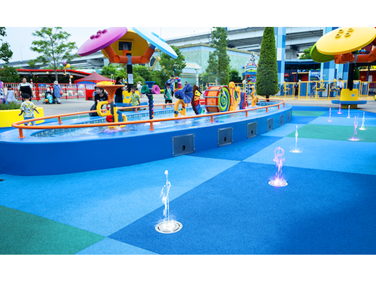 レゴ® ブロックの楽器モニュメントの前に立つとさまざまなメロディとともに、高さ約30~50cmの水柱が色とりどりのライトに照らされながらパチャパチャと噴き出し、視覚や聴覚でも楽しめるエリア。⾶び出す⽔を避けたり浴びたりしながら、親⼦で⼀緒に光と⾳の楽しい⽔遊びを満喫してください♪