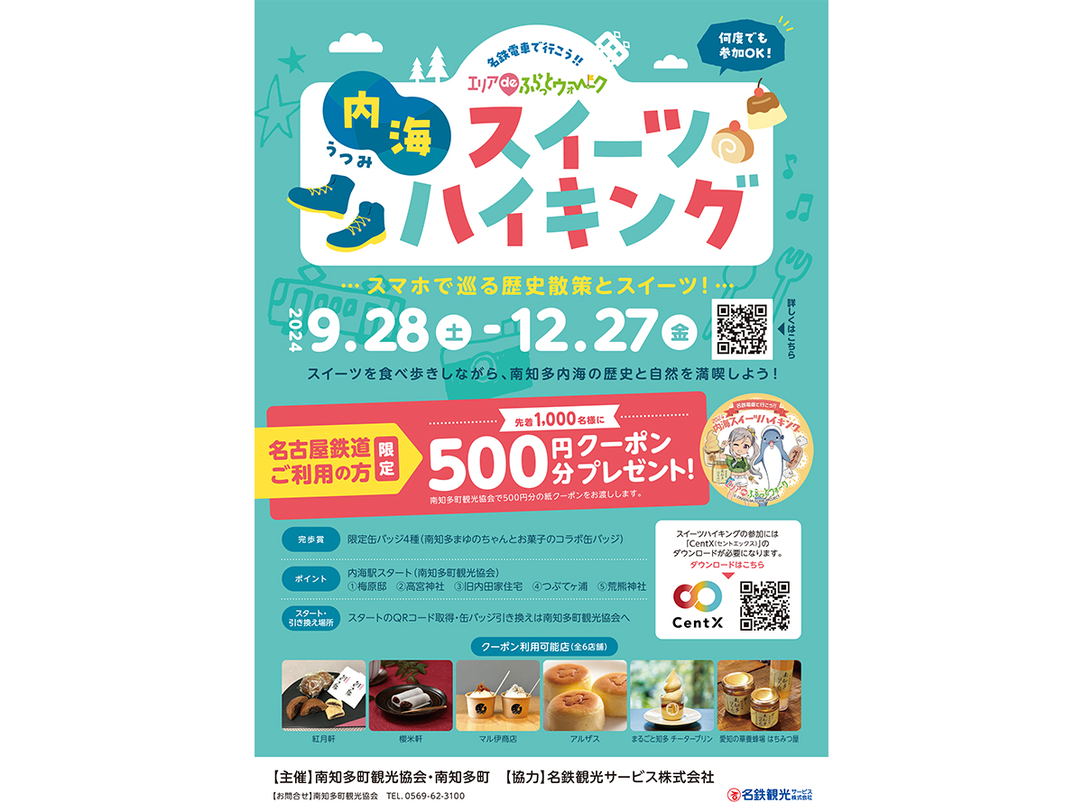 名古屋鉄道ご利用でお越しの方には、スイーツ食べ歩きに使える500円分の紙クーポンをプレゼントします!(先着1,000名様)
