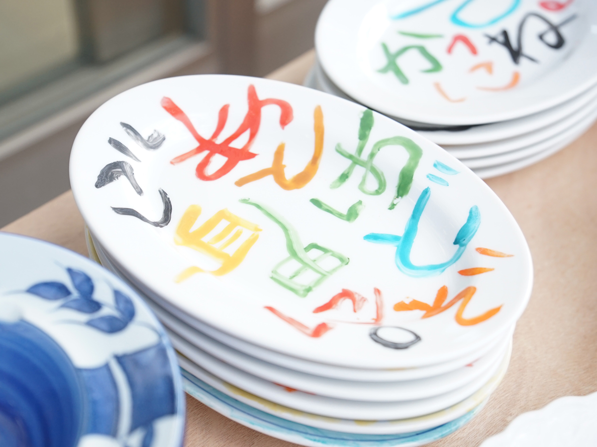 ◎光岡幸一 《あとはどうぞご自由に。》(部分)2024年 / 売れ残った食器・包装紙・看板
