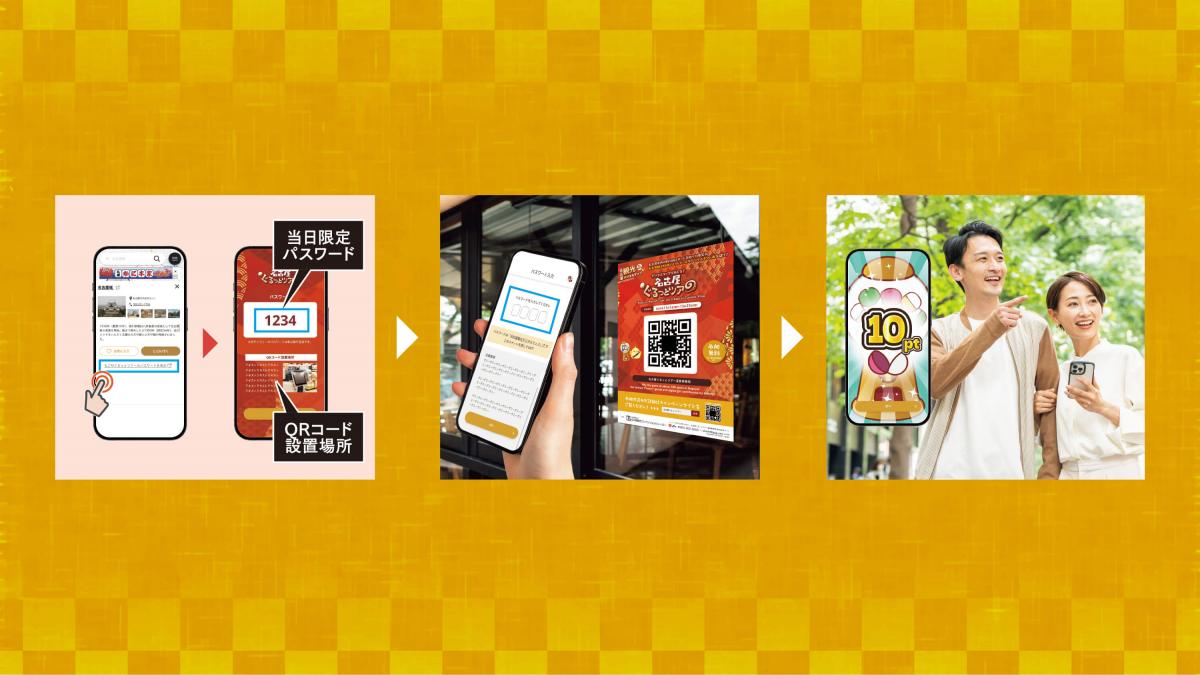 [3] スポットに設置されたQRコードをスマホで読み取り、パスワード入力画面に切り替わったら、[2]で表示されたパスワードを入力!QRコードの設置場所はパスワード表示画面にてご案内しています。