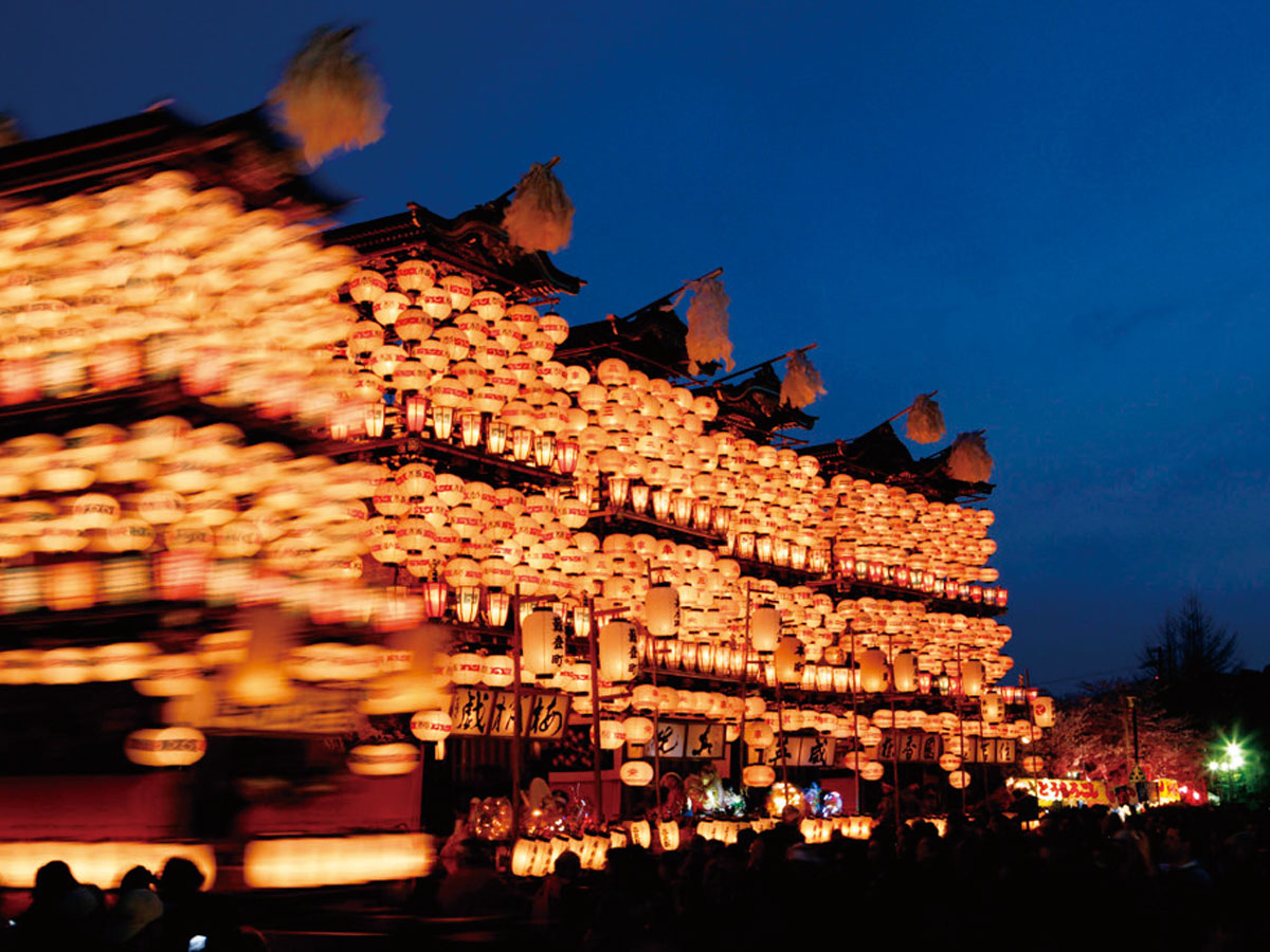 夜は、365個もの提灯がともされた車山が、満開に咲き誇る城下町の桜並木の下を巡ります。そのさまは、豪華絢爛、まるで錦絵を見るような光景です。