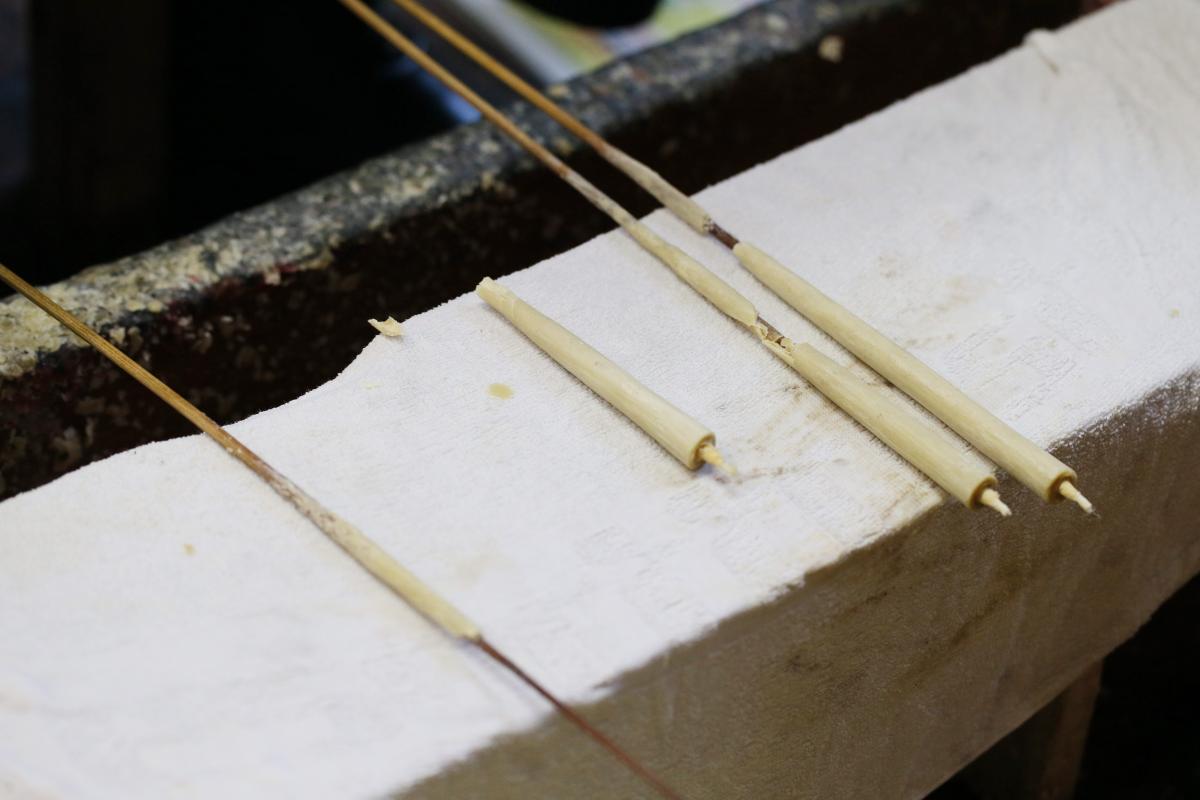 At Master Matsui’s workshop, you can see the crafting process, where he plunges tightly wound wicks made from traditional paper and wrapped around bamboo skewers into the hot, molten wax made from the seeds of the lacquer tree, and layer by layer hand forming the uniquely shaped candles. The larger candles may require as many as 300 layers of wax before they reach the desired size. Wider and the top, thinner at the base, the concave shape of the larger, more distinctive candles is produced by hand with a special plane.