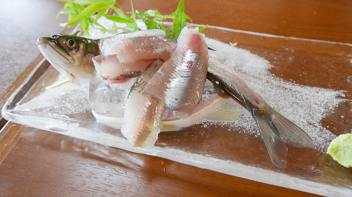 An improvised bridge allows guest to cross the river to opposite side from the shop’s main building. There’s a spacious area covered by wisteria pergolas, providing a much welcome shade. Just a pity that the season for wisteria doesn’t match the season for catching ayu, but judging from the large area covered, it certainly must be a nice sight when the flowers are in full bloom. Anyways, the vibrant wisteria trees cover the tables, benches and barbecue fire pits orderly placed to accommodate even the largest group of guests.