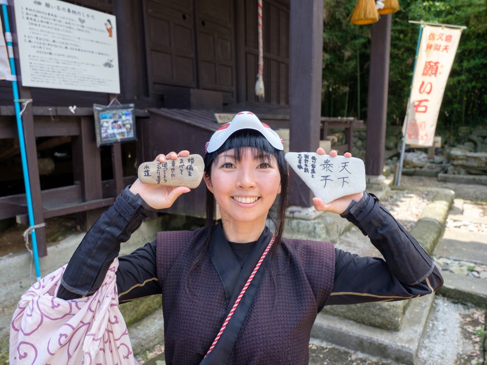 穿過常常的堤防,水蓮來到了一個小島筒島,因為供奉著傳說中的弁天,又叫弁天島。這裡的繪馬很是與眾不同,是滑溜溜的石頭。花300日元買一塊許願石,用油性筆寫下自己的願望供在這裡吧。让我們看看水蓮的願望是什麼?嗯,天下泰平。另一塊呢?戀愛順遂,到底是女孩子啊。