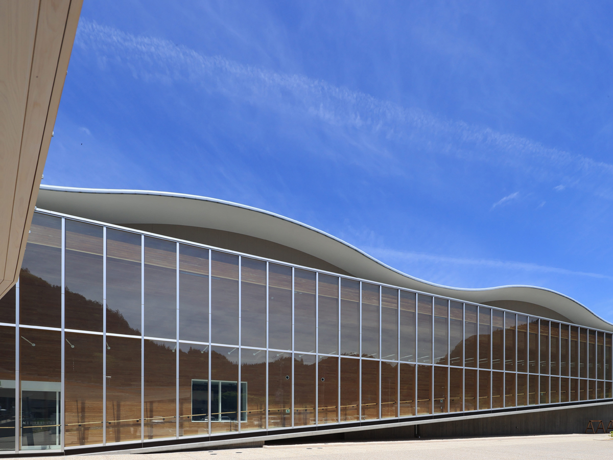 作為建築外觀看點的坡道,大量使用了設樂町出產的檜木,呈現出令人驚嘆的建築美感。