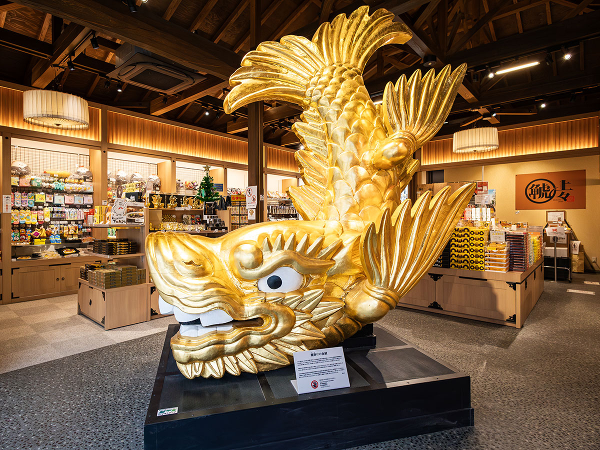 有金鯱坐鎮的禮品店。金鯱與名古屋城屋簷上的實物大小相同,近近距離觀看很有衝擊力! 作為旅遊的紀念很多人在這裡拍照,是人氣很高的拍照點。