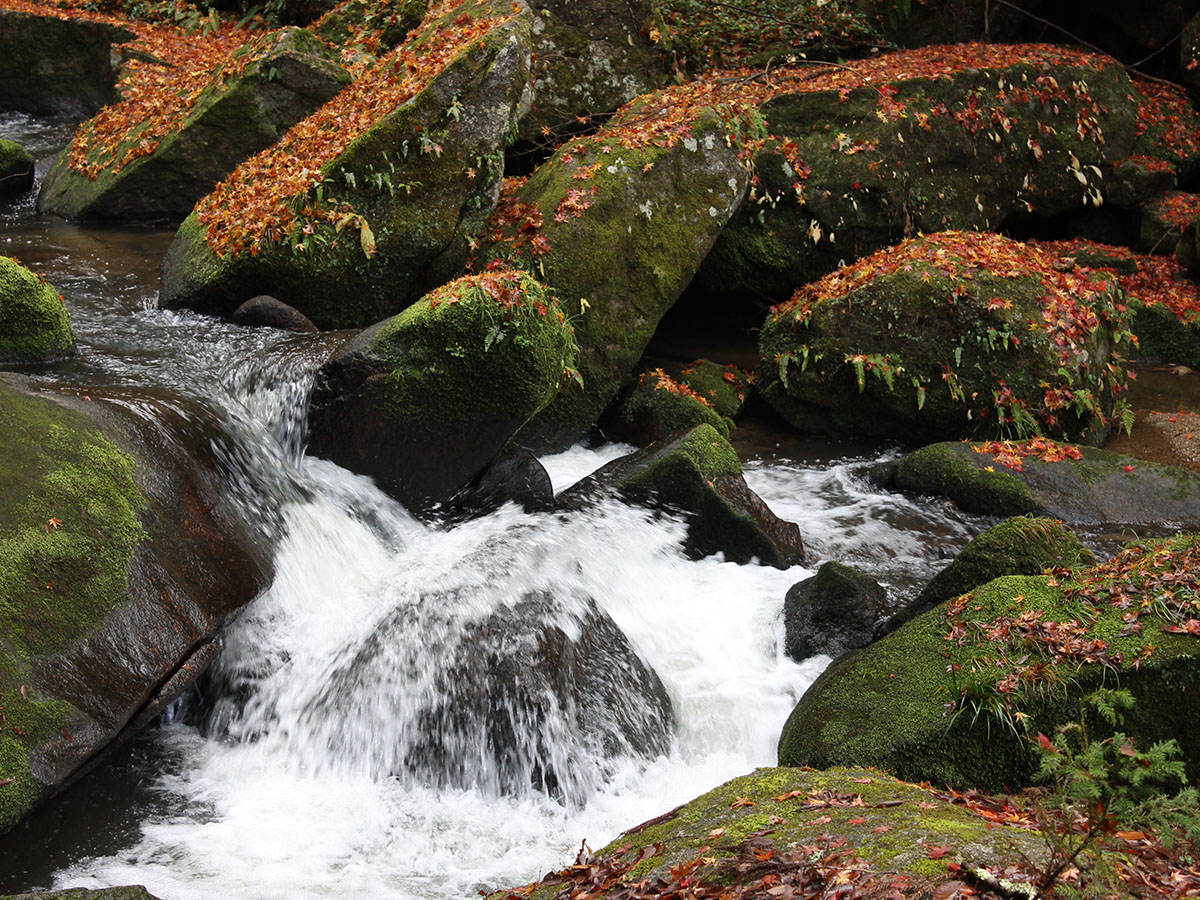 在約300米溪流的最下游,有從一瀑到七瀑各種落差的瀑布。富有變化的瀑布的滔滔水流形成的溪谷美景可以讓人心緒平靜。尤其是秋天的紅葉,美的令人驚嘆不已。