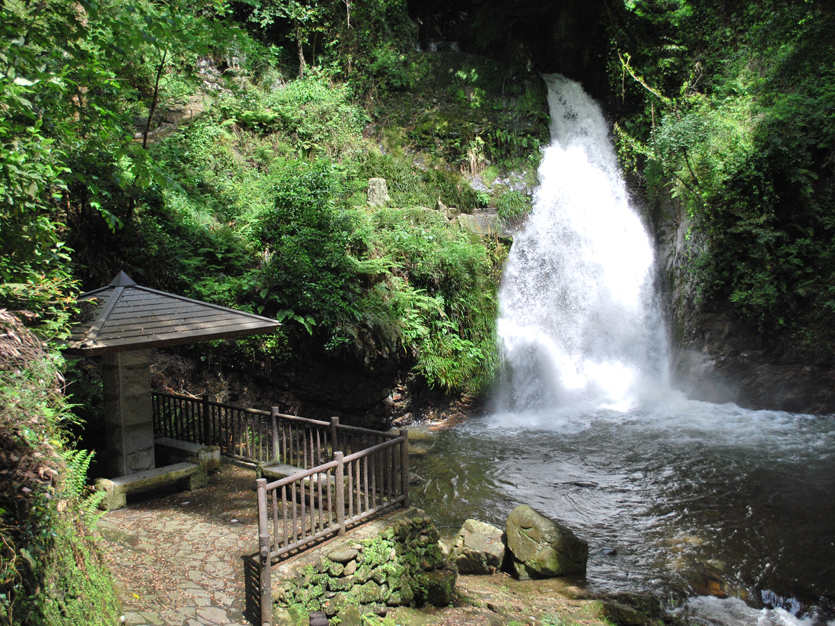 牛瀑自古就作為三河的名勝之一而知名。有高10m、寬2m多的雄瀑布和高4m、寬4m的雌瀑布,夏季有很多前來尋求清涼的遊人。因為瀑布潭附近被米槠等天然林覆蓋而多濕,蕨類為首的各種植物繁茂,非常涼爽。這個瀑布還流傳著名字由來的傳說,是很有魅力的景勝地。