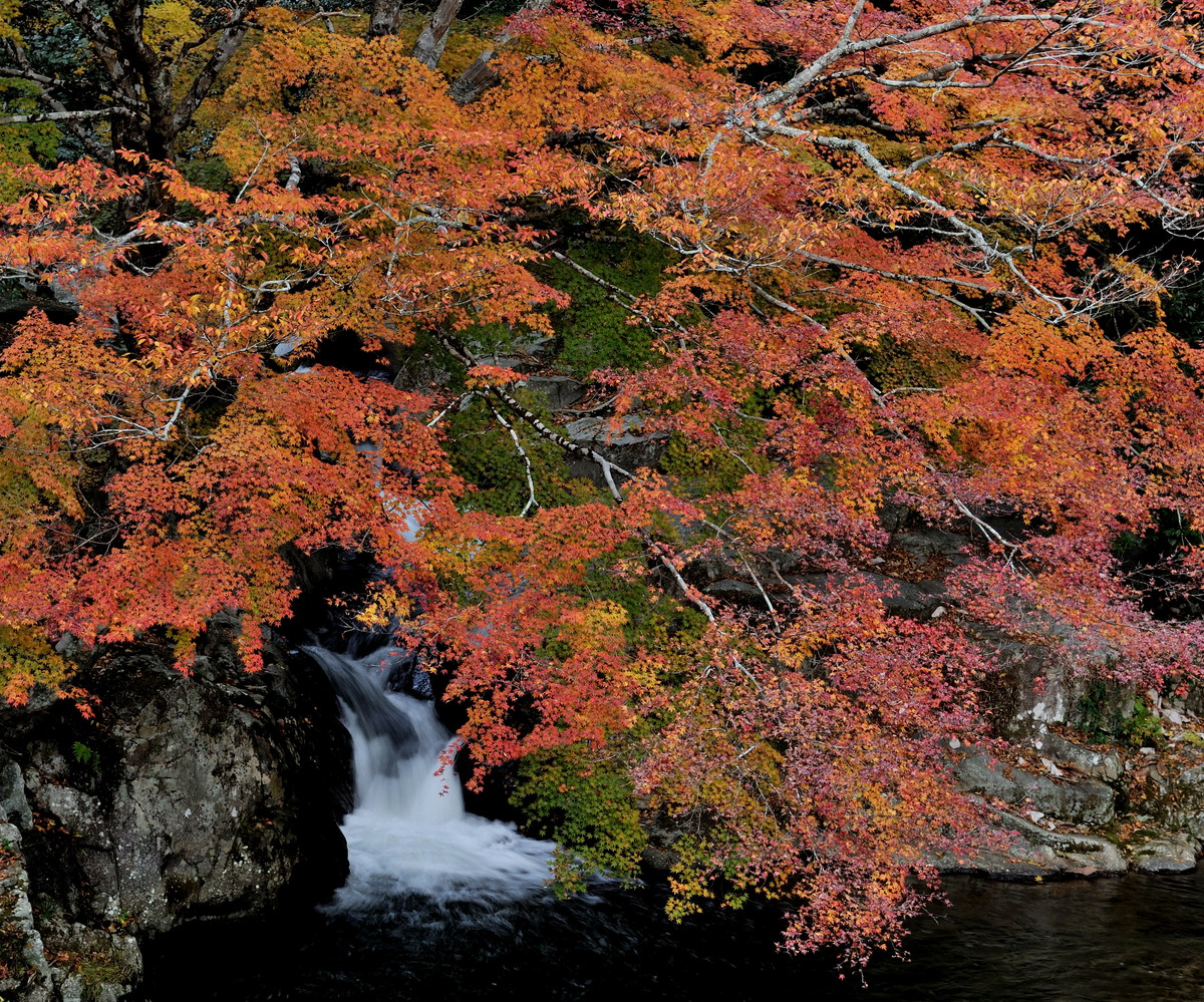 長約300m溪流的最下游有一瀑布到七瀑布等各種落差的7個瀑布。富有變化的瀑布流動交織成的溪谷美讓人內心平靜。特別是秋季的紅葉,美的令人窒息。11月中旬~12月上旬是紅葉最佳觀賞期。