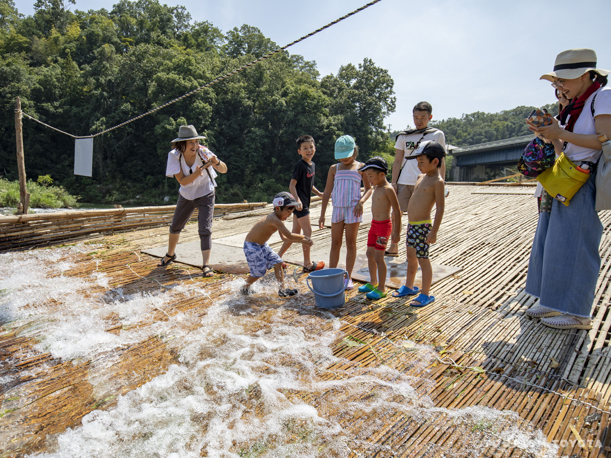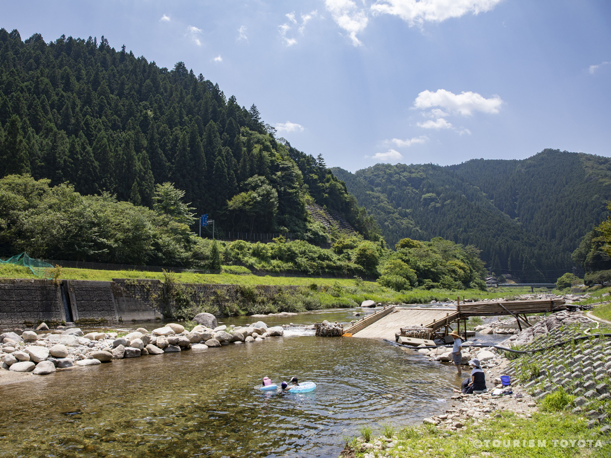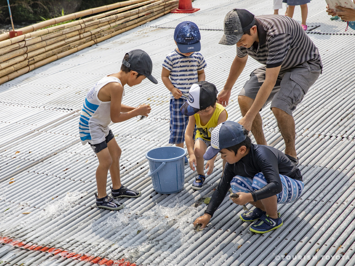魚梁是在香魚為了產卵沿河而下的時節,攔住河水,鋪上竹席,抓獲和水一起流下的香魚。6月到9月,魚梁迎來手抓香魚的季節,很多帶孩子的家庭在這裡享受玩水的樂趣。從西三河到奥三河有不少觀光魚梁,去體驗一下吧♪