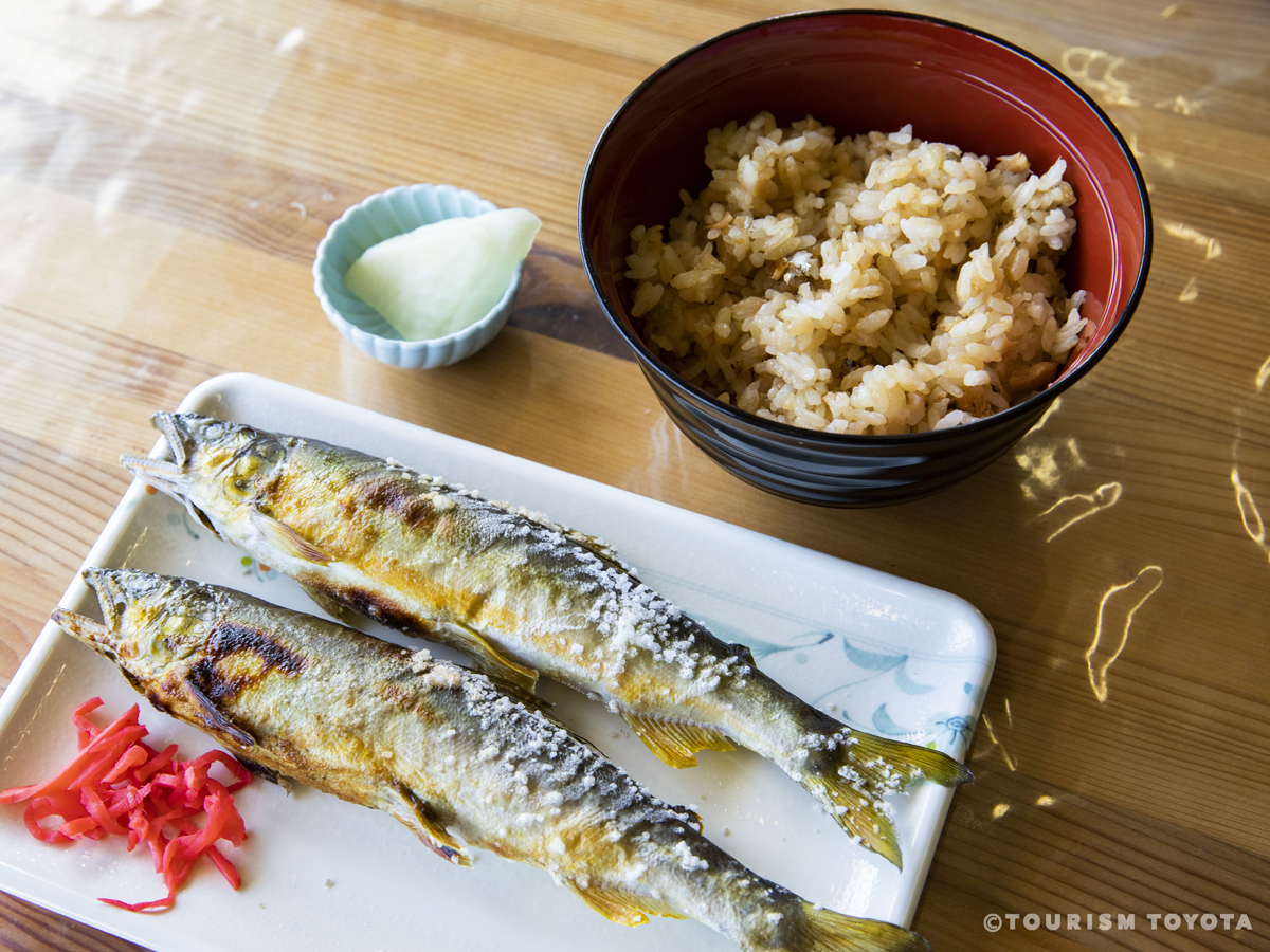 今年手抓魚是“江鮭”!!個頭比香魚大,味道非常鮮美♪ 而且,可以品嚐草鞋一樣大小的五平餅和河魚等設樂町特有的美食也是八雲苑的魅力。在寒狹川捕獲的香魚用来鹽烤當然美味,松軟熱乎的香魚雜燴粥也很推薦。
