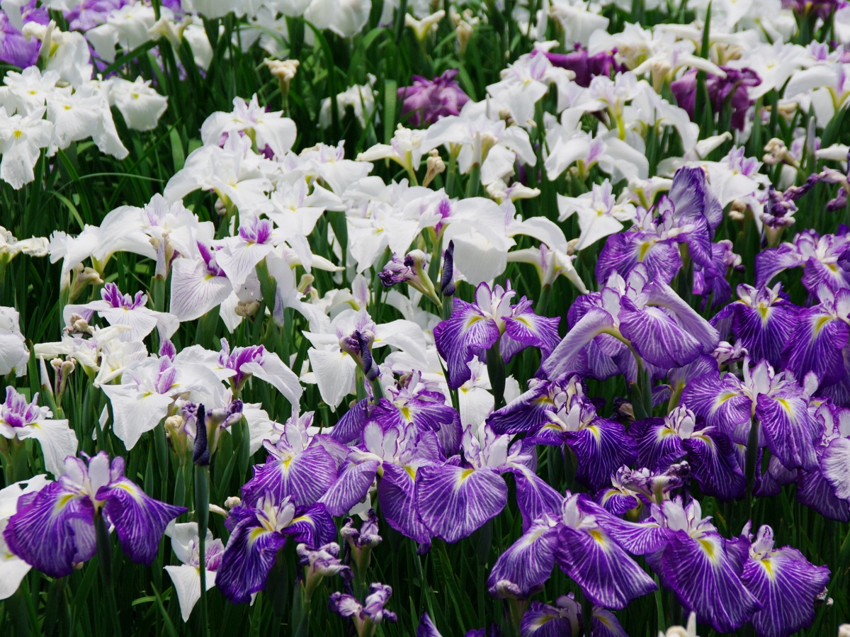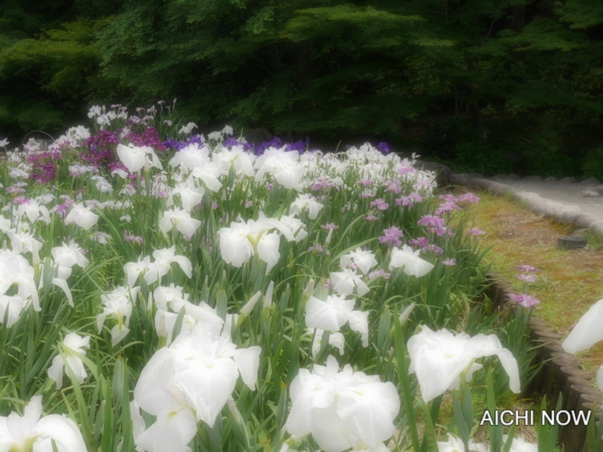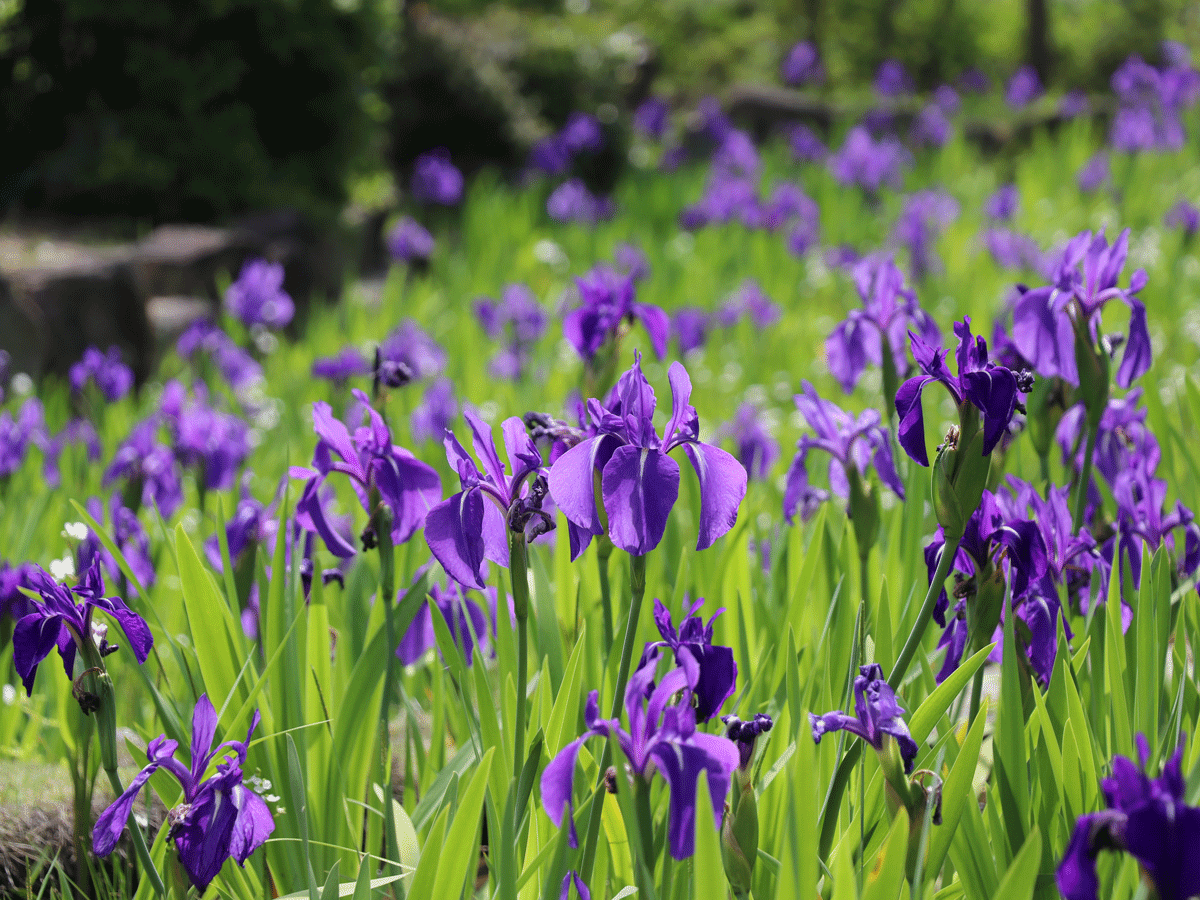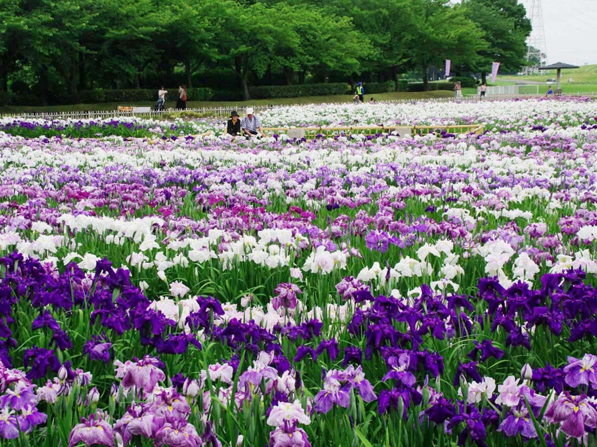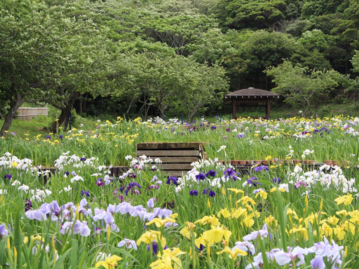 在種植著100個品種、約5,000株花菖蒲的園內,6月初之後的3個星期是最佳觀賞期。 可以一邊悠閒漫步,一邊觀賞凜然的紫色花朵。