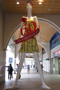 非常適合作為集合地點的名古屋市名鐵百貨店前的巨型人體模特“NANA醬”作為名古屋站前的門面深受大家的喜愛。她的身高居然有6.1m。這樣的NANA醬總是隨著季節大變身!夏天換上泳衣或浴衣,神誕節前後變身為聖誕老人,最近還從鼻子噴白色煙霧,總之非常多樣。到訪名古屋的時候,一定要去看看NANA醬的新時尚哦♪