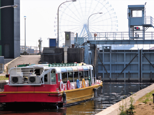 乘坐顏色鮮豔的遊船巡遊中川運河!從位於青波線笹島Live站附近的中川運河堀止的“笹島Live”到“金城埠頭”之間有條水上航線,有定期遊船運行。中途有隔開保持在一定水位的中川運河和水位隨著漲潮退潮發生變化的名古屋港的兩個水門,可以體感水位發生變化時船身高度也隨著變化。還在運河度假村和港區AQULS停靠,歡迎移動+觀光時乘坐。