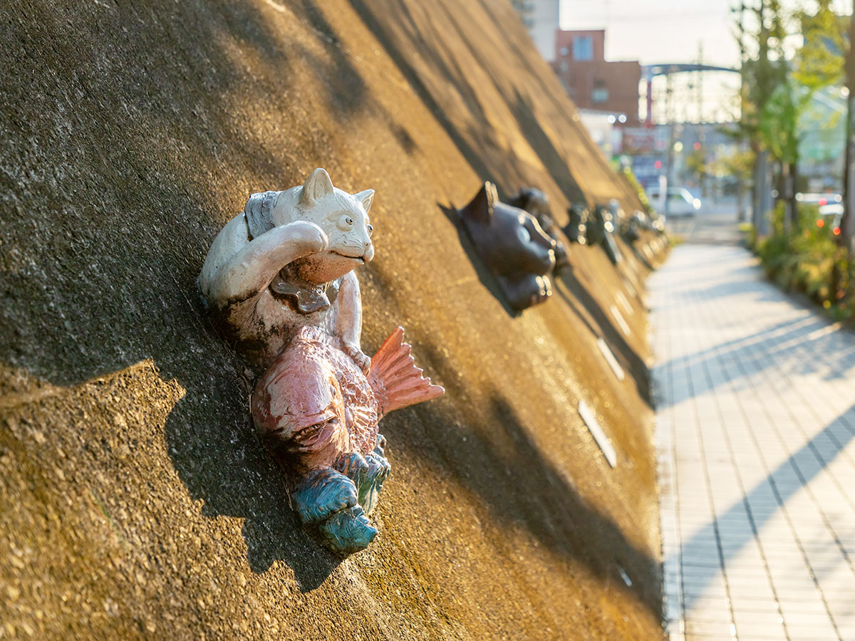 從名鐵常滑站通向“陶瓷器散步道”的起點“陶瓷器會館”的道路邊的混凝土牆壁上,裝飾著由跟常滑有淵源的39位陶藝師和工匠製作的各種貓造型,這條小道被大家親切地稱為“招財貓通”。