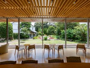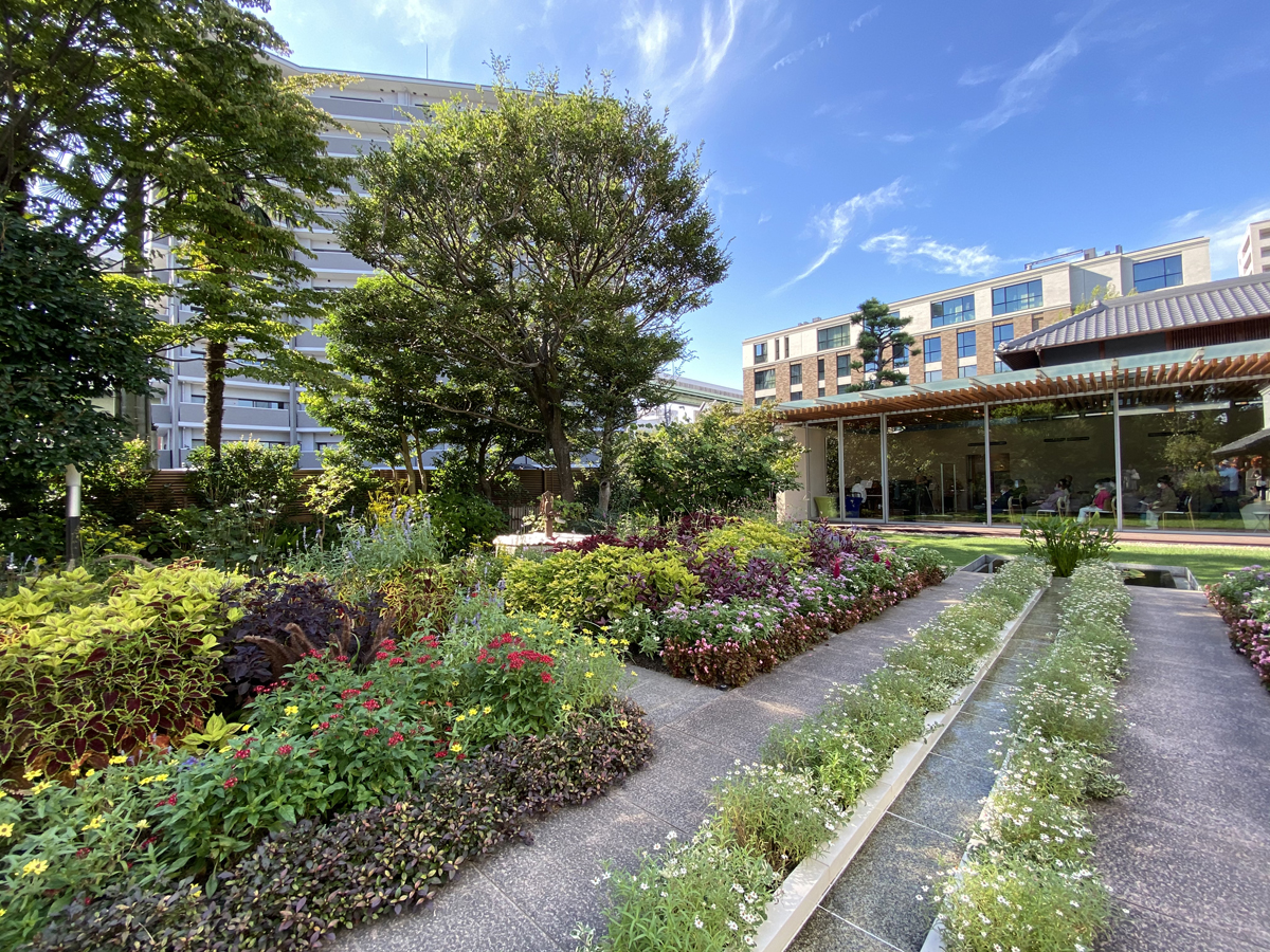 在曾經的主屋舊址上建造的大廳內,可以自助享用茶水和咖啡。放眼窗外,庭園內的花草讓人愉悅。這裡栽種著“百花百草圖屏風”中描繪的約90種花草中的70多種。
