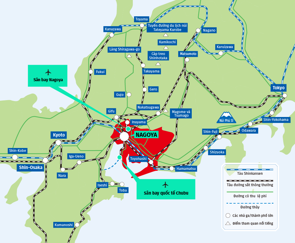 Giữa Tokyo, Nagoya và Osaka được kết nối bằng tàu Tokaido Shinkansen nên có thể dễ dàng đi đến các đô thị lớn từ tỉnh Aichi.